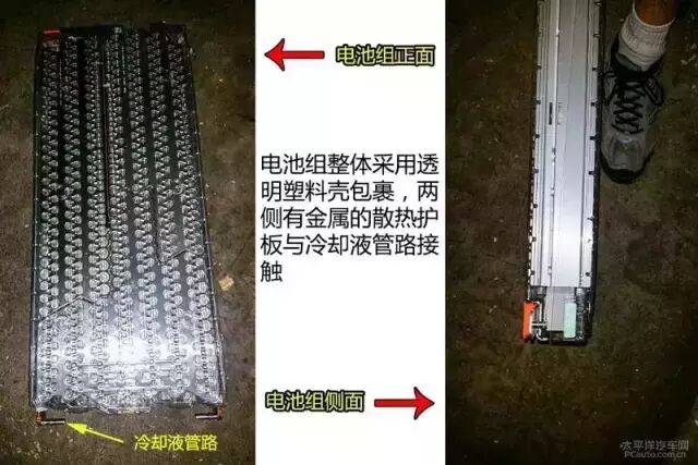 电池组整体由透明塑料壳包裹住,两侧有金属散热护板包围。电池厚度比脚掌稍稍厚些,属于扁长型电池组,从而导致车辆重心可大大降低。总体电池组保护的相当不错。