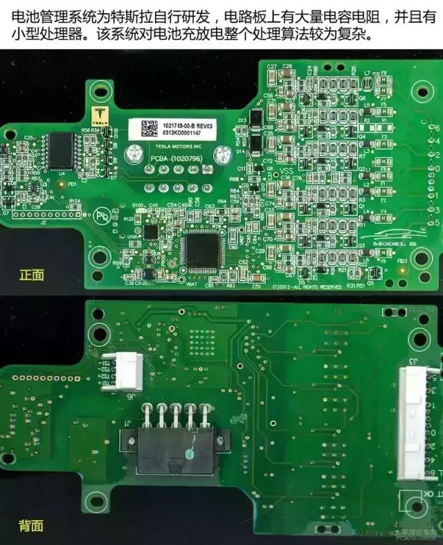 电池管理系统主要功能包括数据采集、电池状态计算、能量管理、热管理、安全管理、均衡控制和通信功能等。从电路图上可看到,电池管理系统为特斯拉自行研发,拥有高度的知识产权的核心技术。该系统能自行处理充放电以及发热问题。相信国内厂商较难山寨出来。