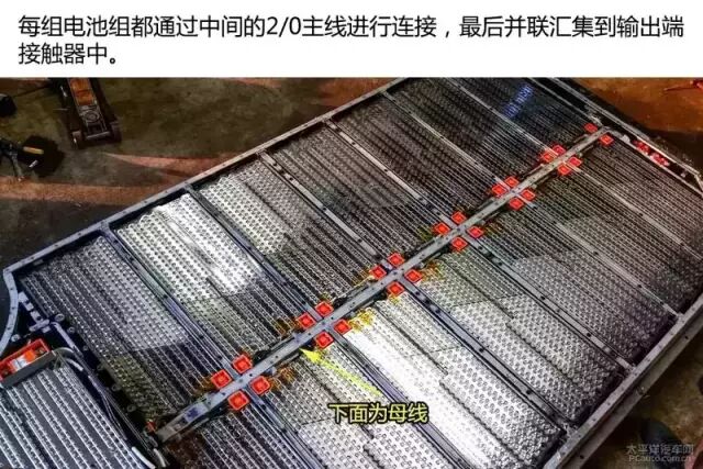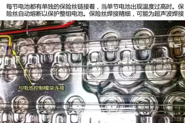 电池组内每一节电池都有保险丝链接着,以防单节电池过热危及整体电池过热,并且每节电池保险丝焊接非常精美。电池组中央有线连接到电池控制模块,这些线用来检测电池组的电压,从而保证电池组正常工作。