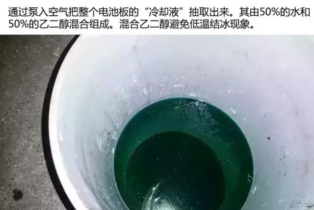“冷却液”呈绿色,由50%的水和50%的乙二醇混合而成。“冷却液”配合着铝管使用主要是为了保持电池温度的均衡,防止电池局部温度过高导致电池性能下降。特斯拉的电池热管理系统可将电池组之间的温度控制在±2℃。控制好电池板的温度可延长电池的使用寿命。