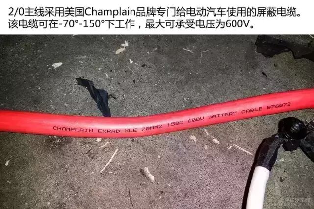 电池板中央有一条2/0主线,每组电池组都通过该主线串联输出电流,因此2/0主线尤其重要。特斯拉采用美国Champlain的专门为电动车生产的线缆,其最高可承受600V电压,并且可在-70°-150°之间工作。2/0主线保护的相当不错,不仅有护板保护,而且还有防火材料包裹。这一点可猜测其工作时有可能产生高温。